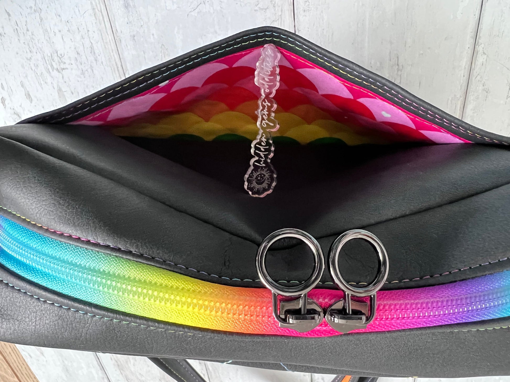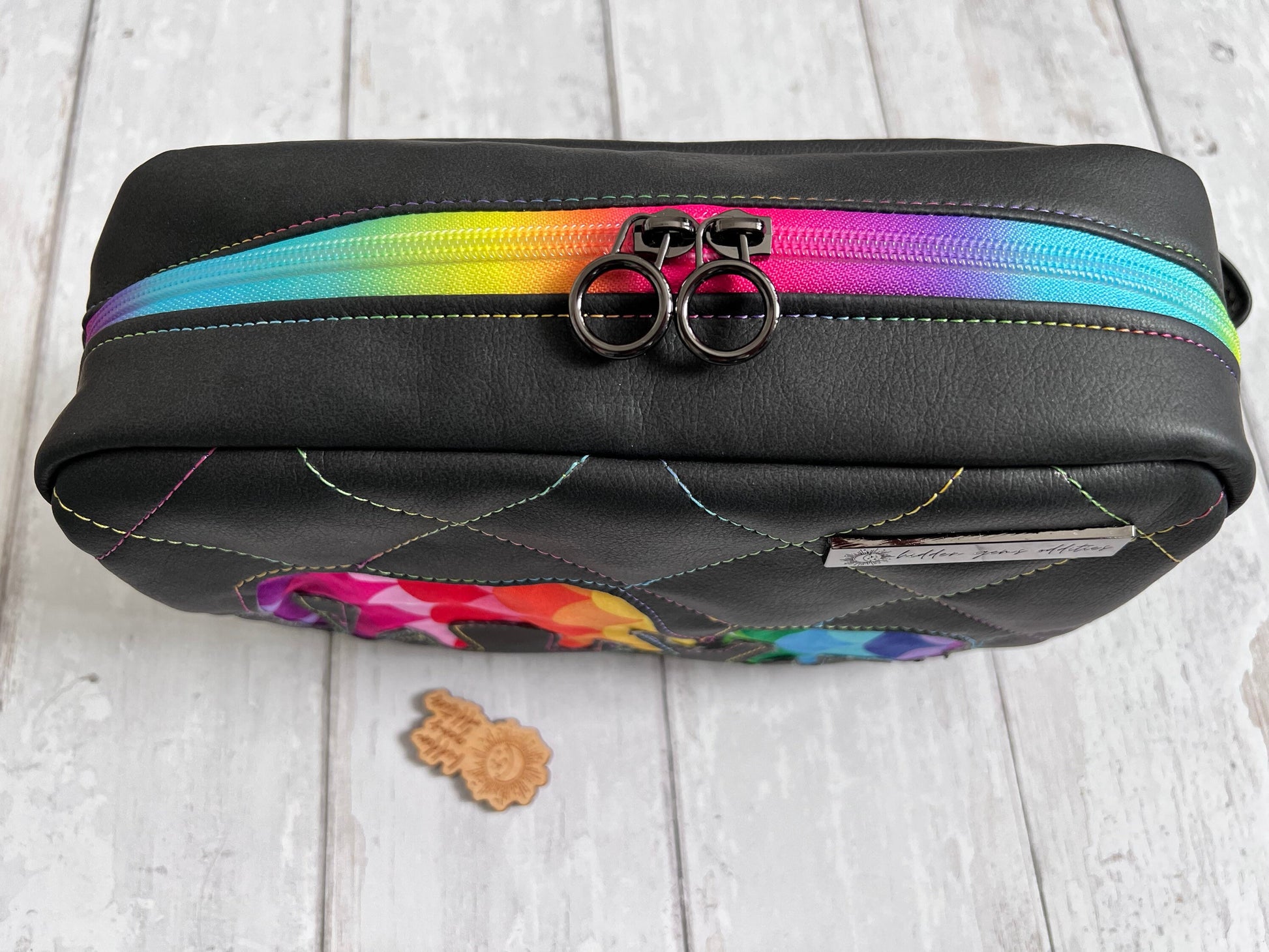 This bag is is all about elephants! Featuring a mum and baby elephant in rainbow print with rainbow thread perfectly set off by a deep grey vegan faux leather made from 100% recycled plastic. Perfect gift to celebrate a special woman in your life, this elephant is leading the way for her calf!