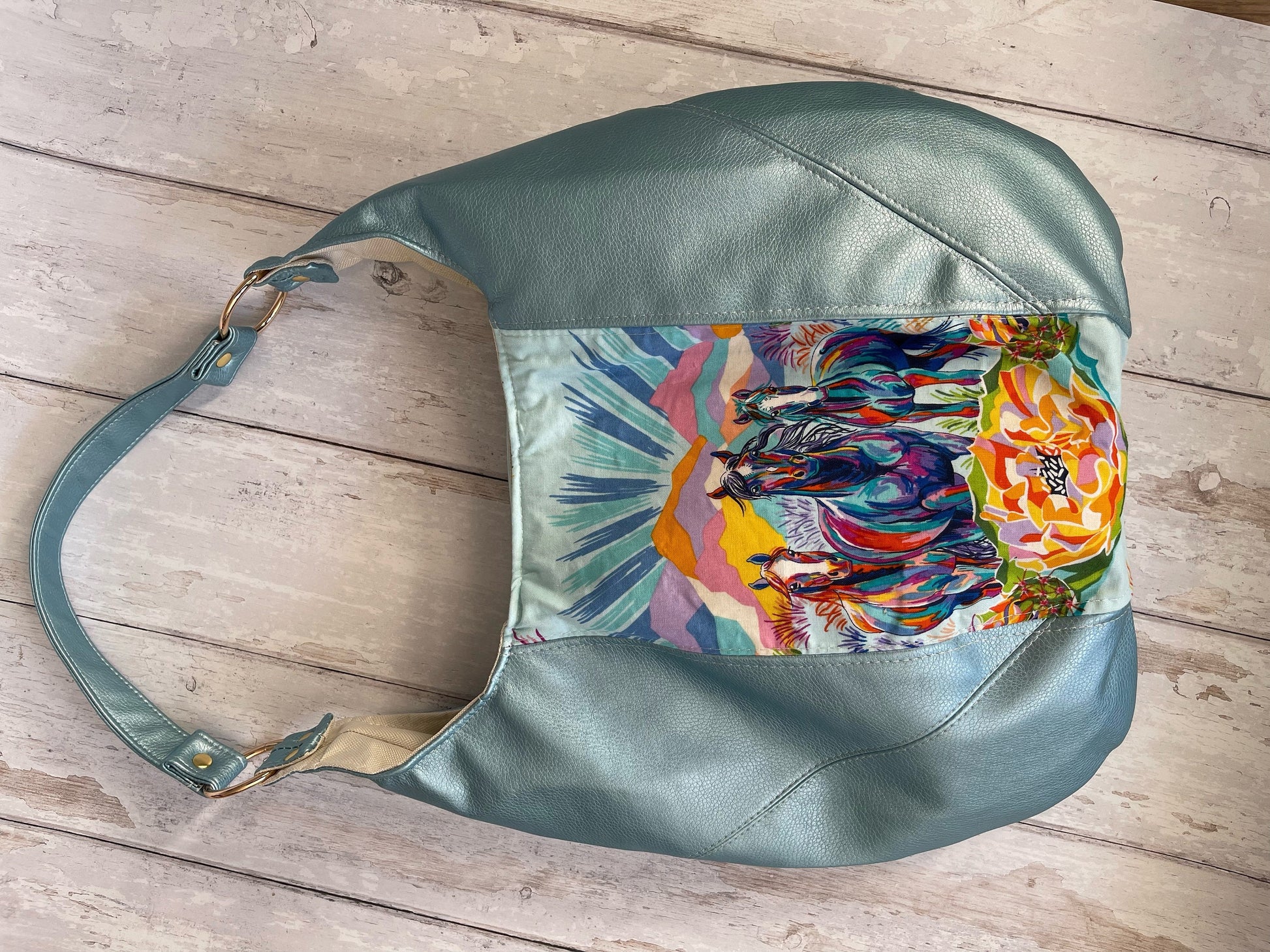 Inspired by encounters with wild horses in the USA, artist Lorraine Turner created this stunning fabric that I had to showcase in the lovely hobo shoulder bag. All proceeds from the sale of this fabric go towards supporting the conservation of endangered animals, and 10% of the price of this bag will also be donated. The front and back features the same panel of three horses, with sky blue metallic faux leather and a waterproof canvas lining. The bag has a lovely hobo shape, and includes a zipped pocket in the interior with a magnetic snap closure.