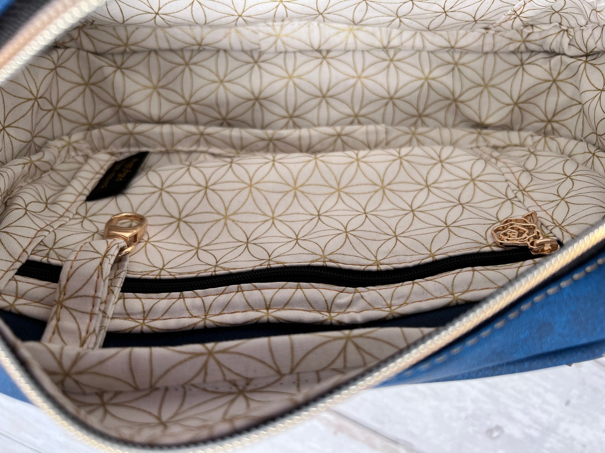 This bag is the complete handbag and wallet combination, made in stunning marine blue vegan faux leather with contrast gold quilting and hardware. The gold metallic flower of life print lining fabric complements the bag beautifully, and the rose zip pulls add a unique touch to the bag.