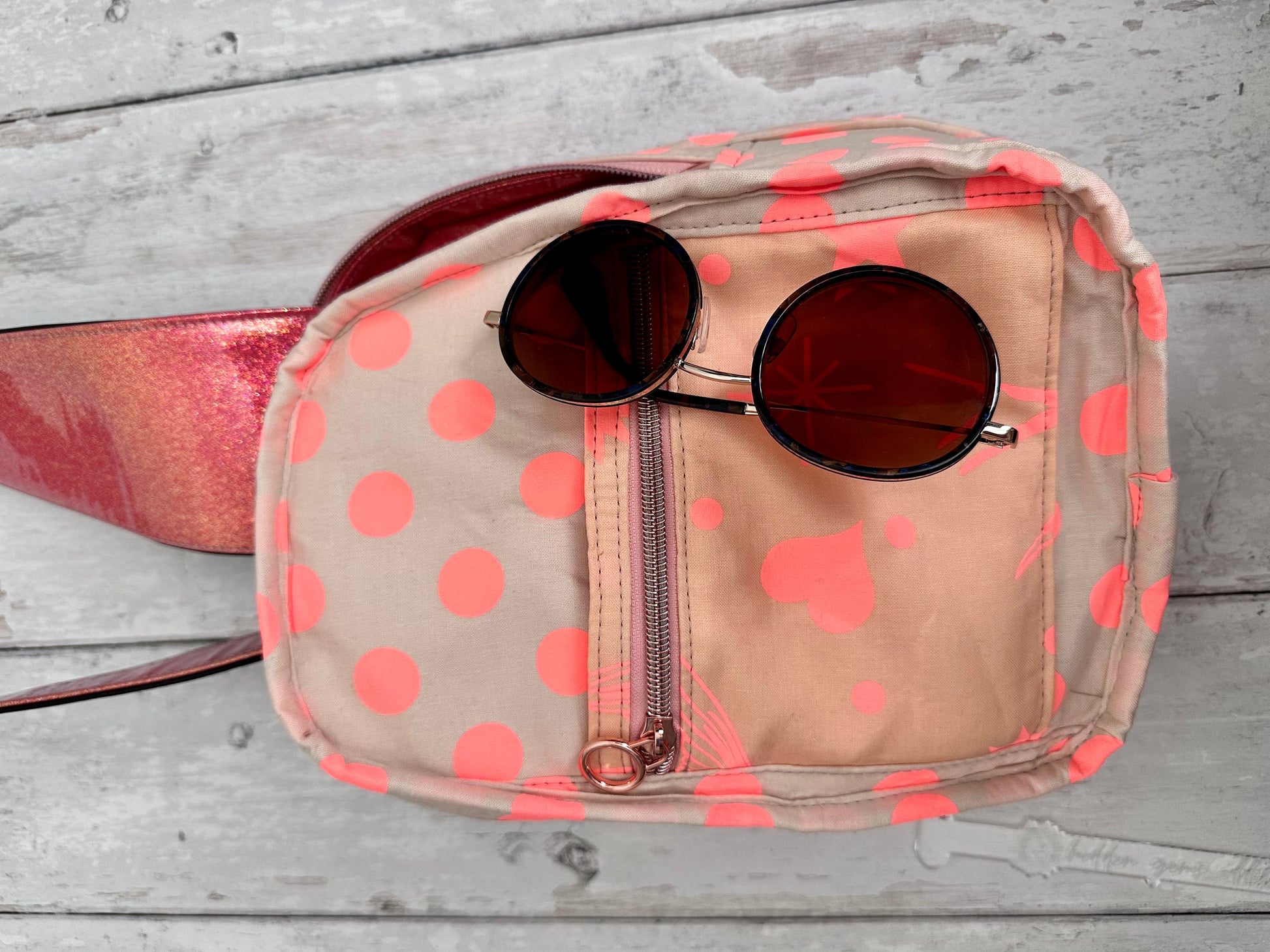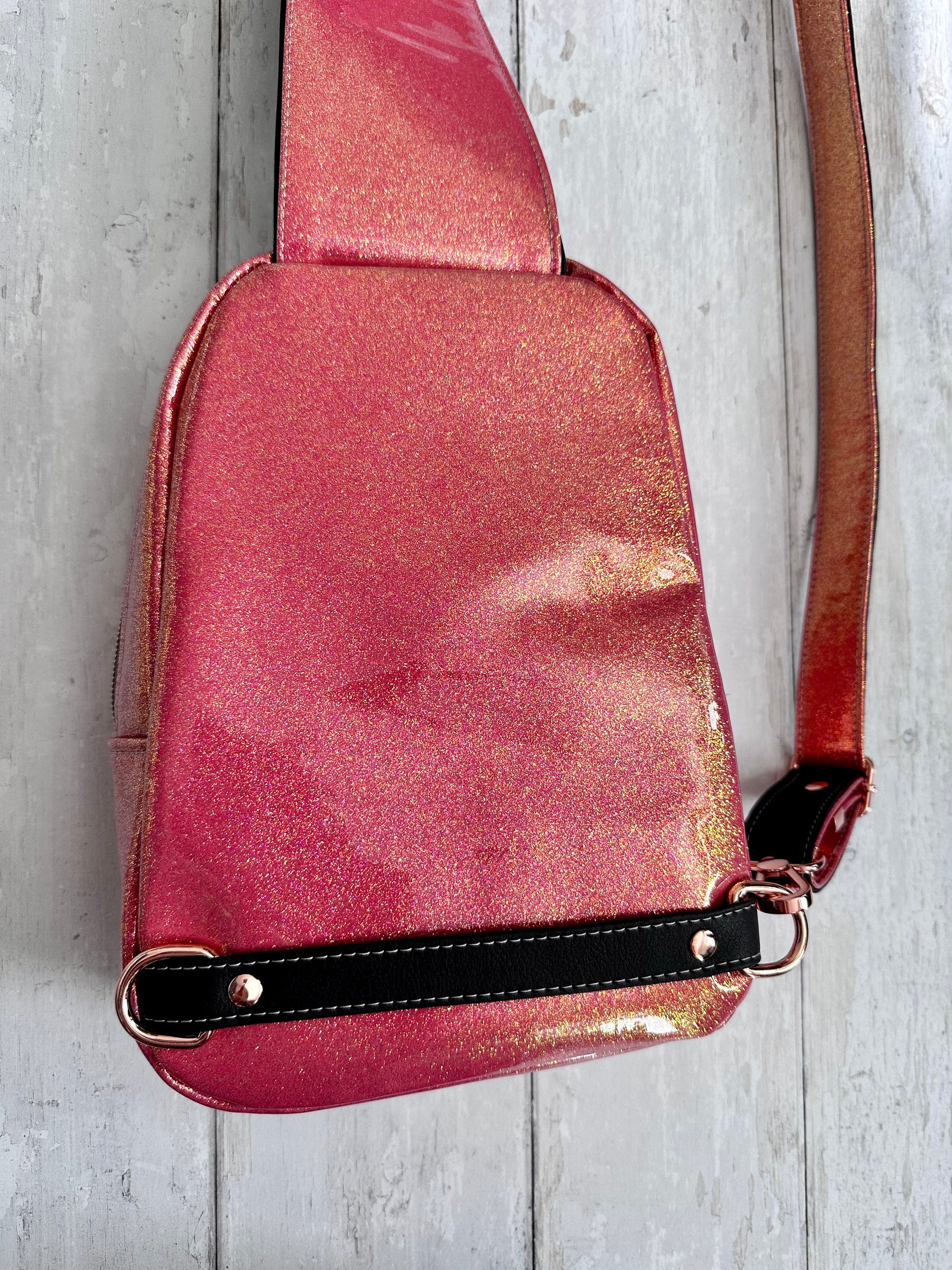 Stand out from the pack with this one of a kind bag, featuring a majestic lion print, paired with coordinating glitter vinyl with a stunning coral/orange/pink shift, and charcoal grey accents.