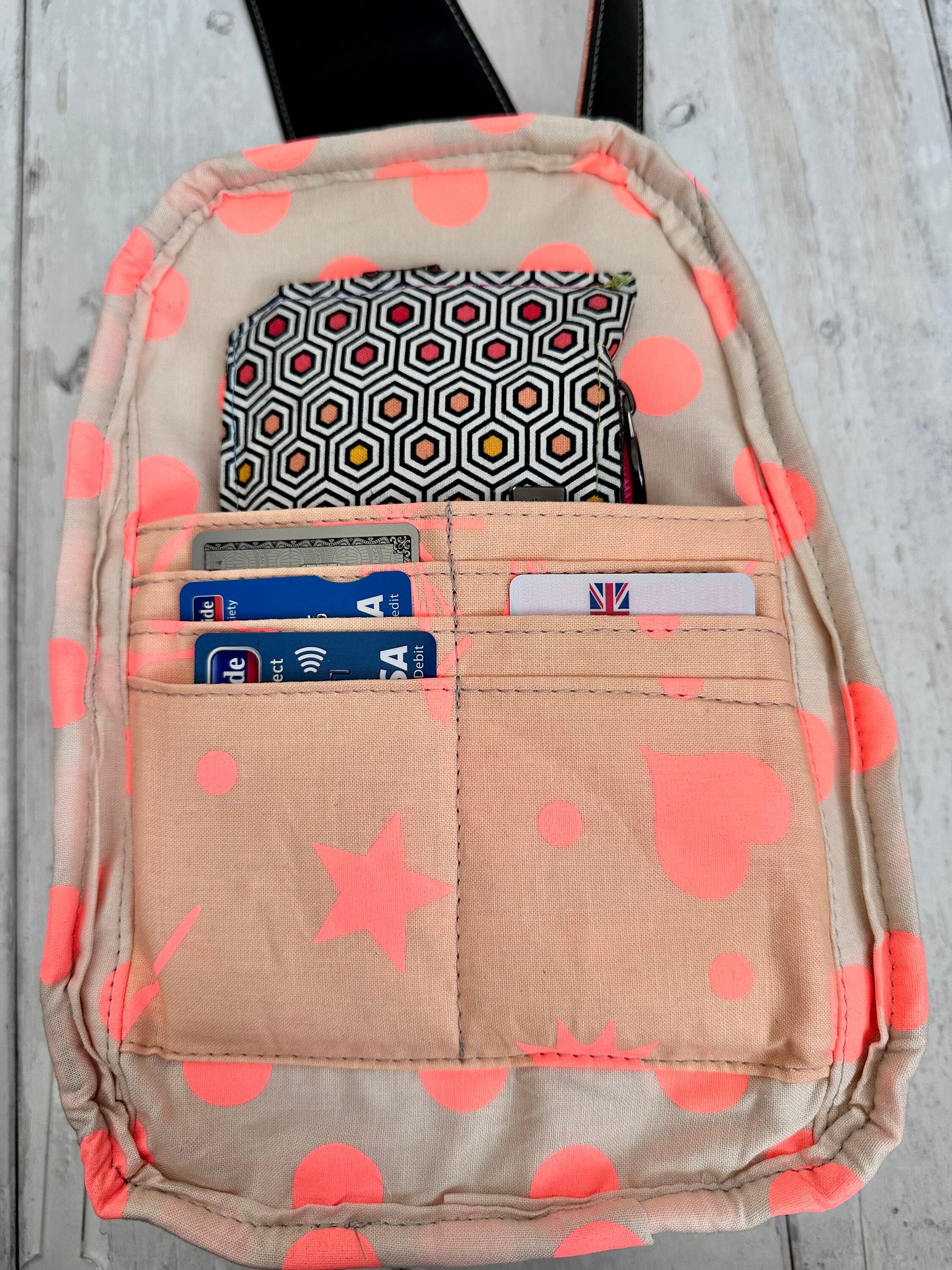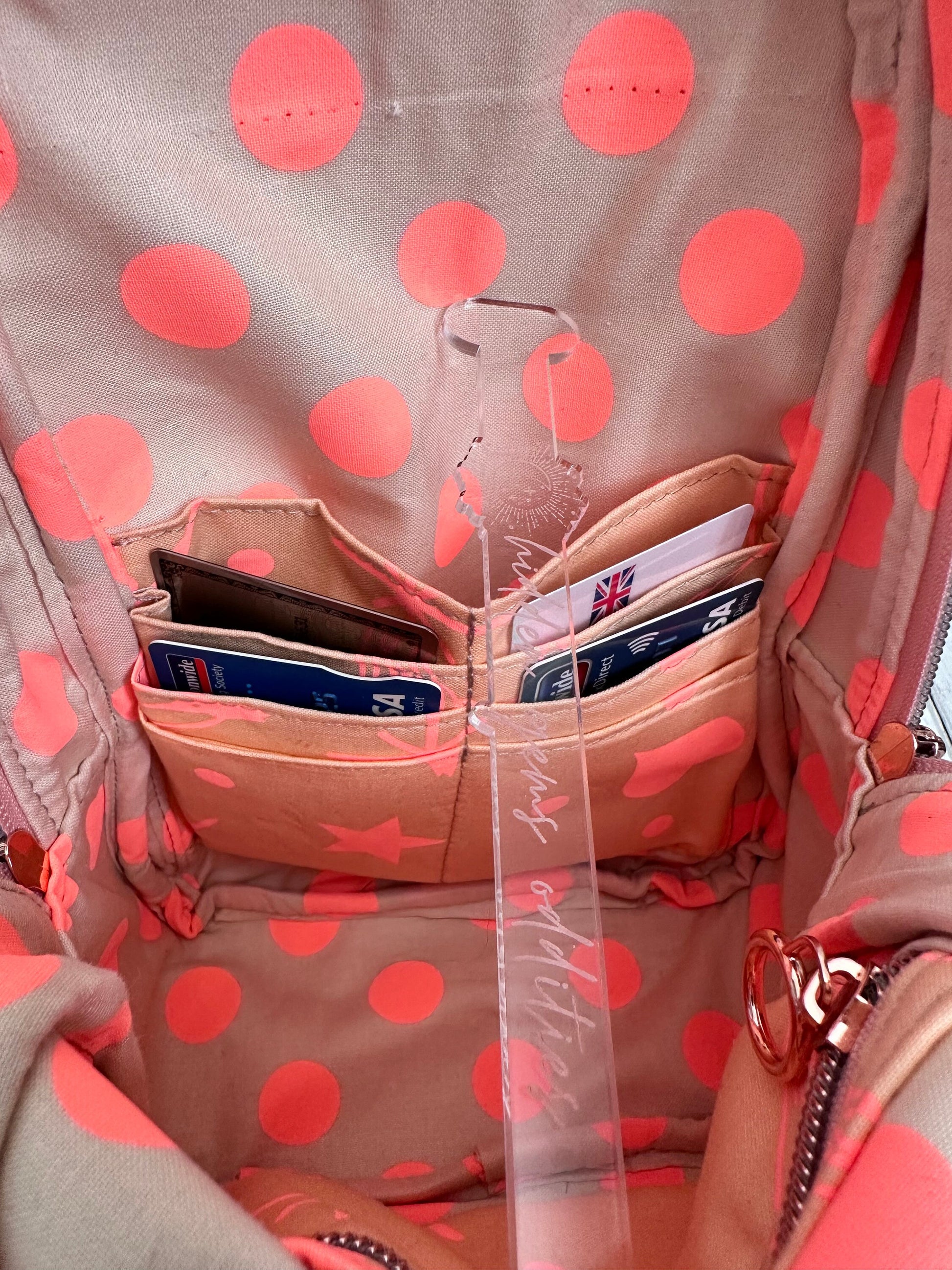 The interior is neon orange polka dots and features 6 vertical card slots, a zip pocket and 2 slip pockets.