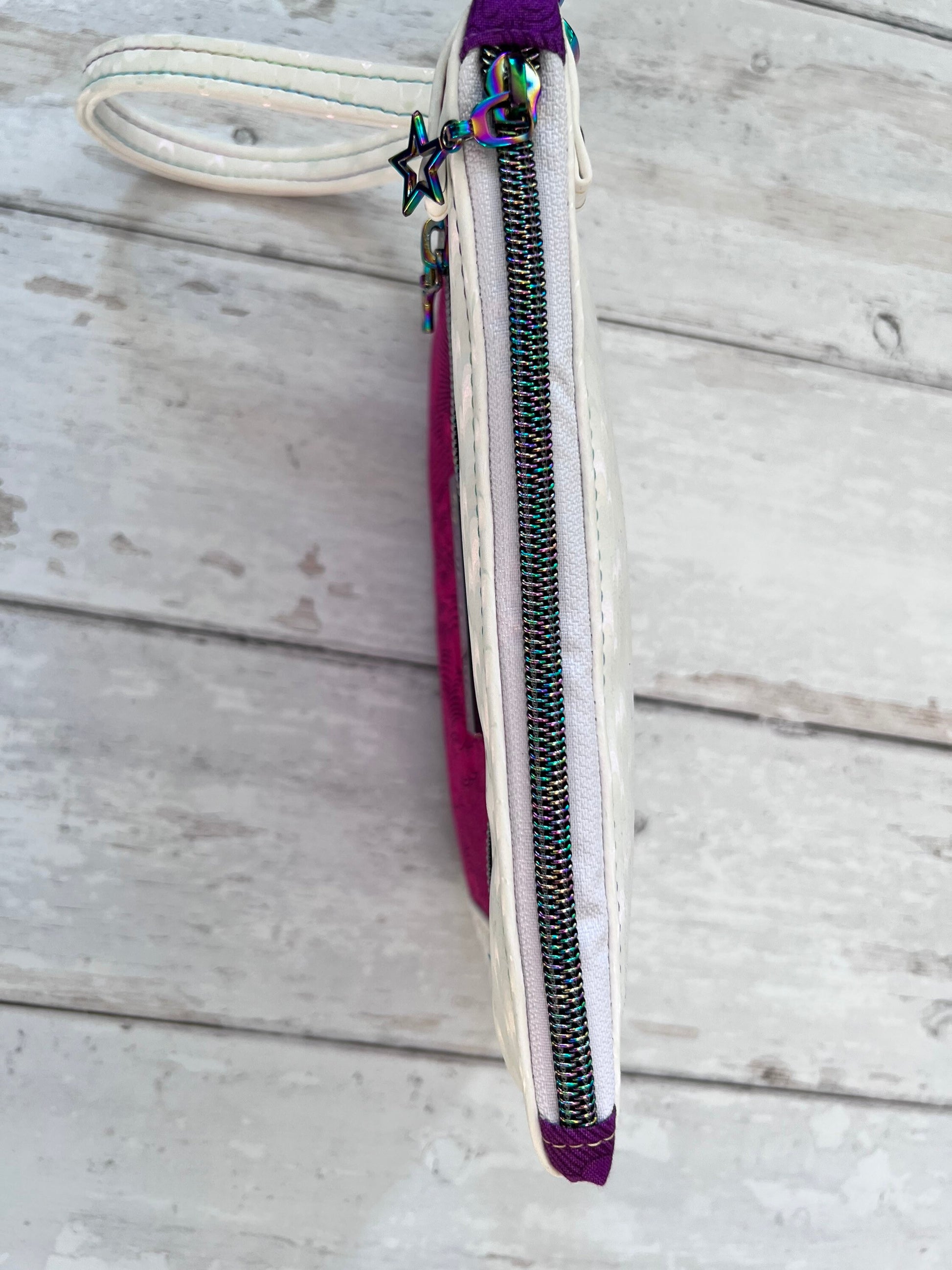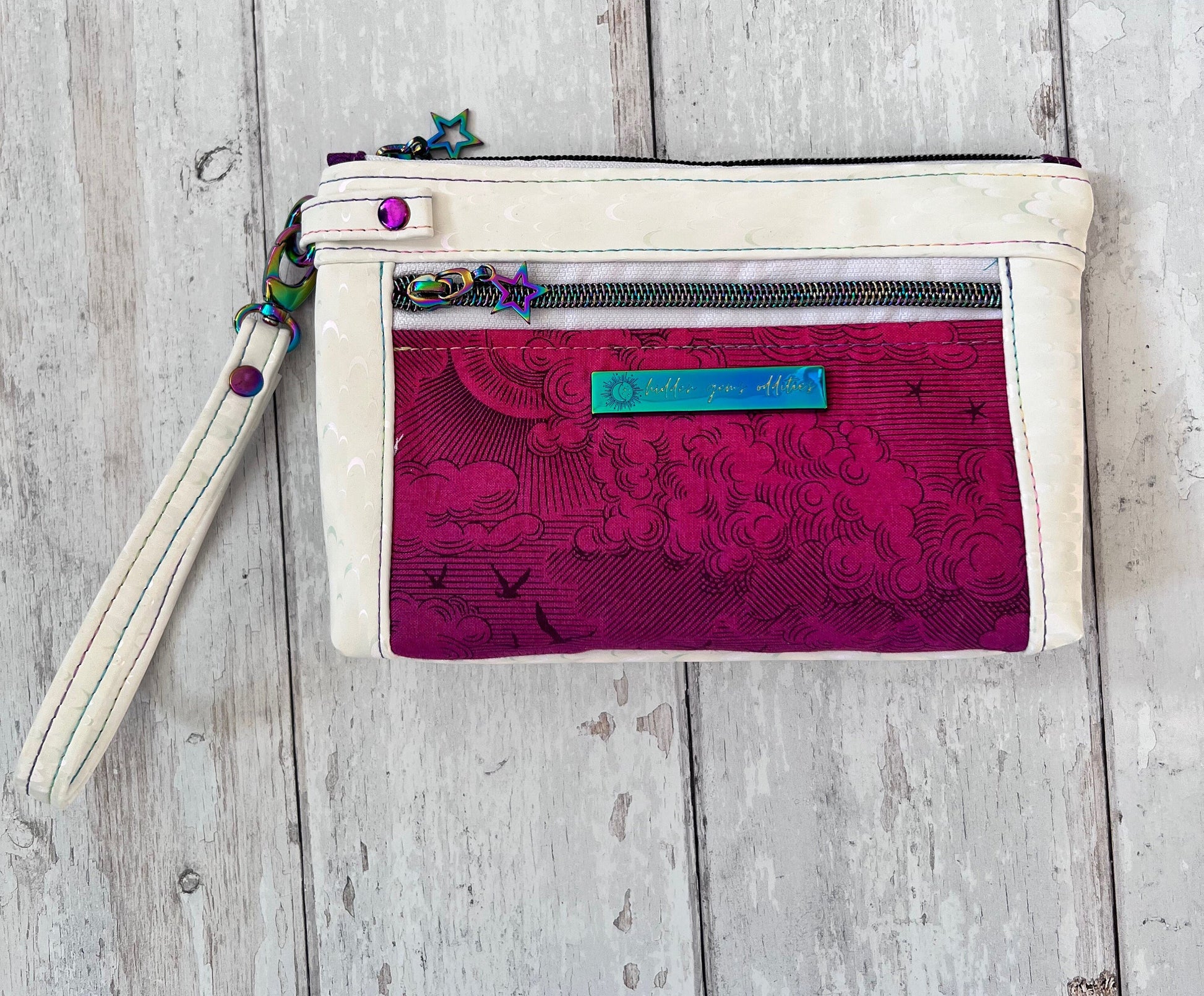 This pouch features a white vegan faux leather with subtle shimmer and gorgeous ombré sunset designer Tula Pink print feature fabric that is also used for the lining with rain hardware and contrasting pastel rainbow stitching.