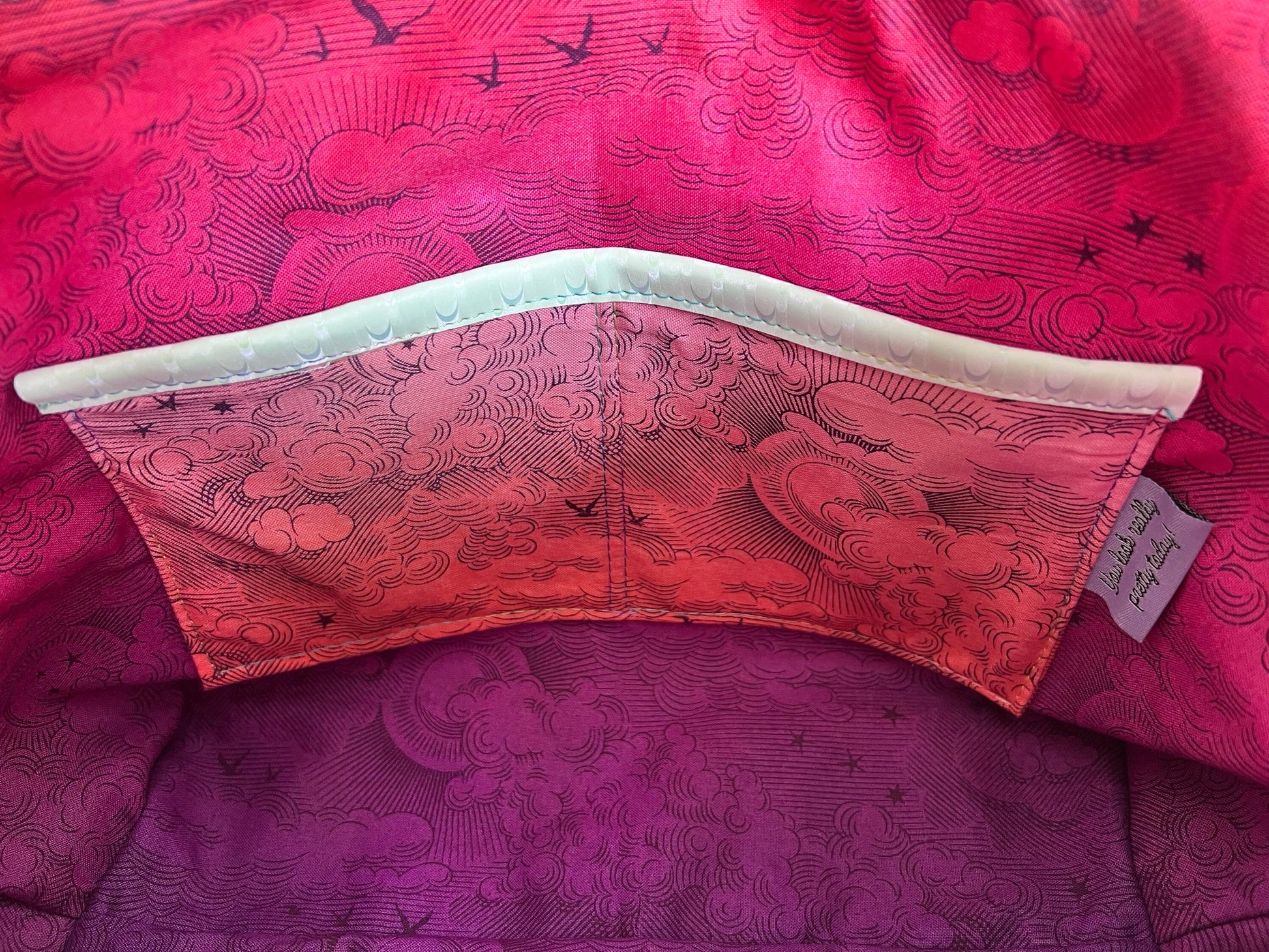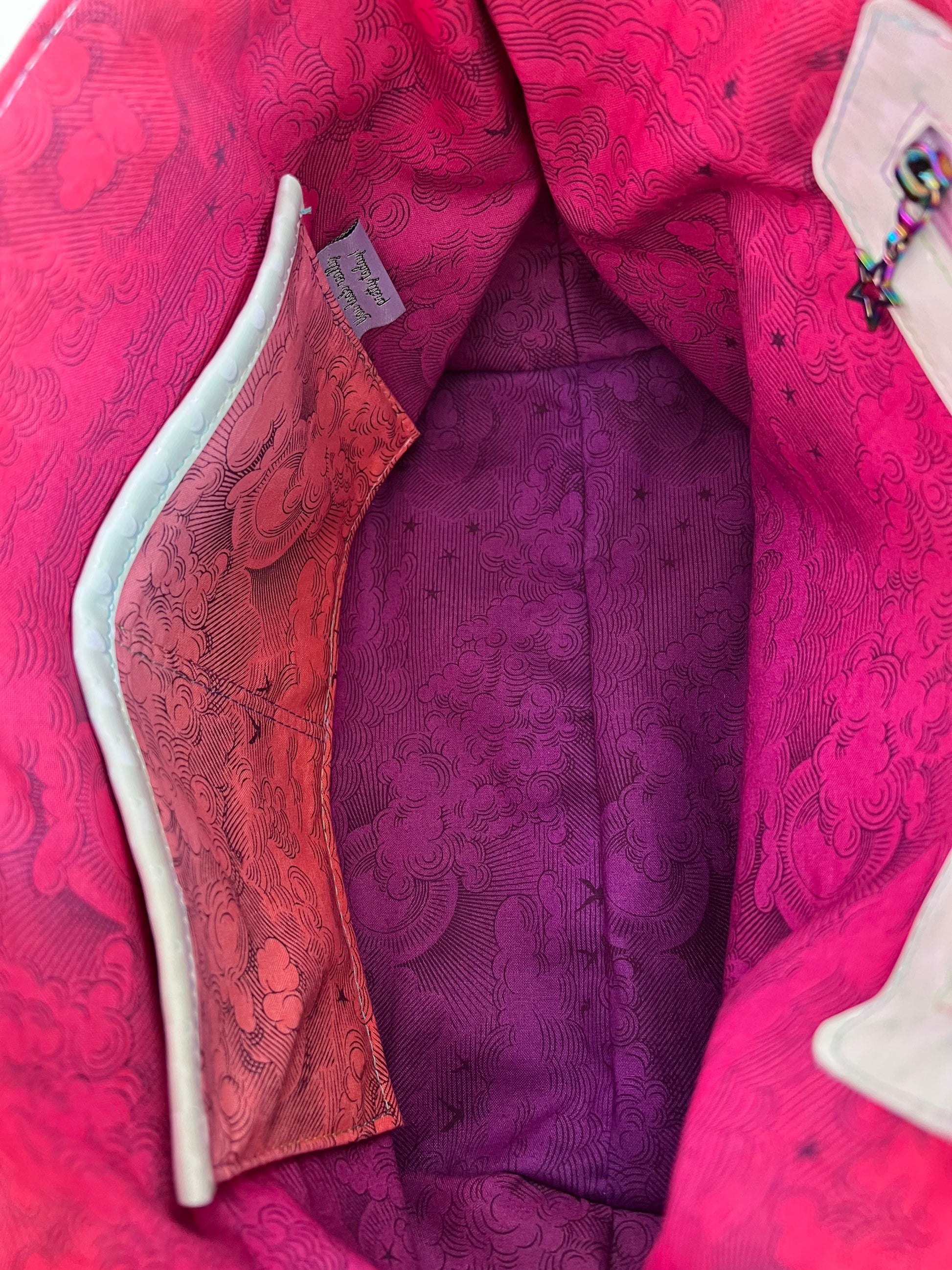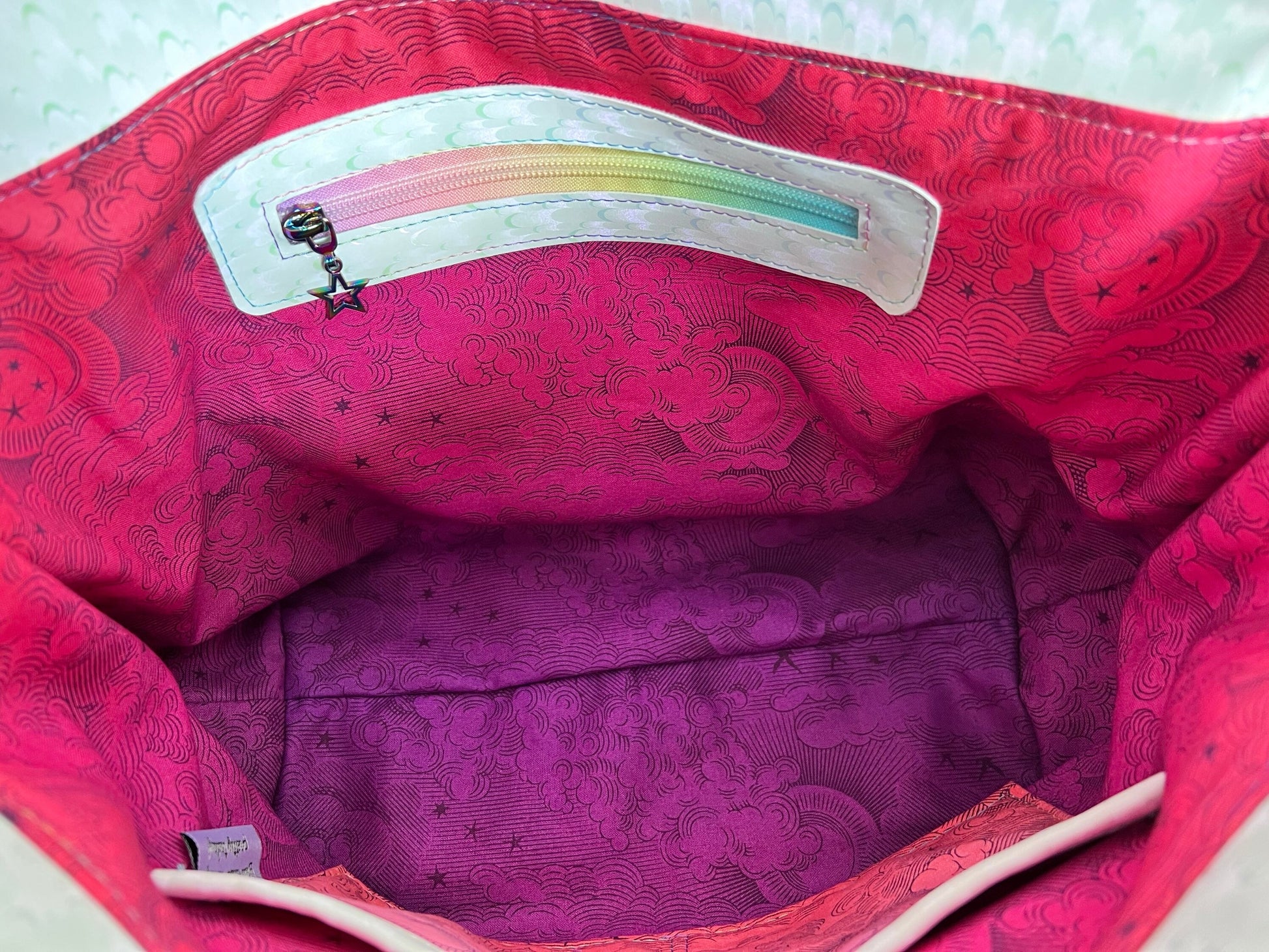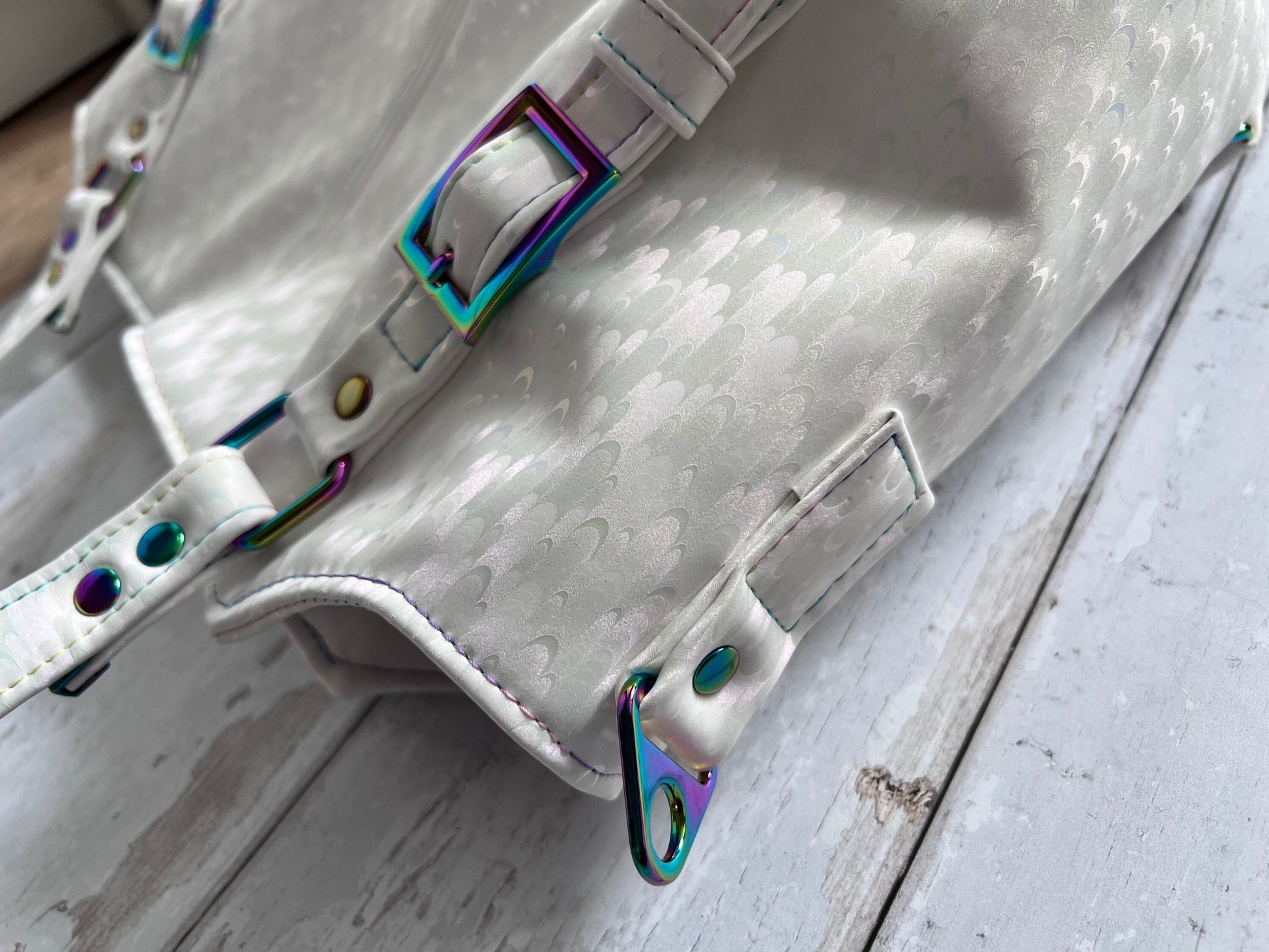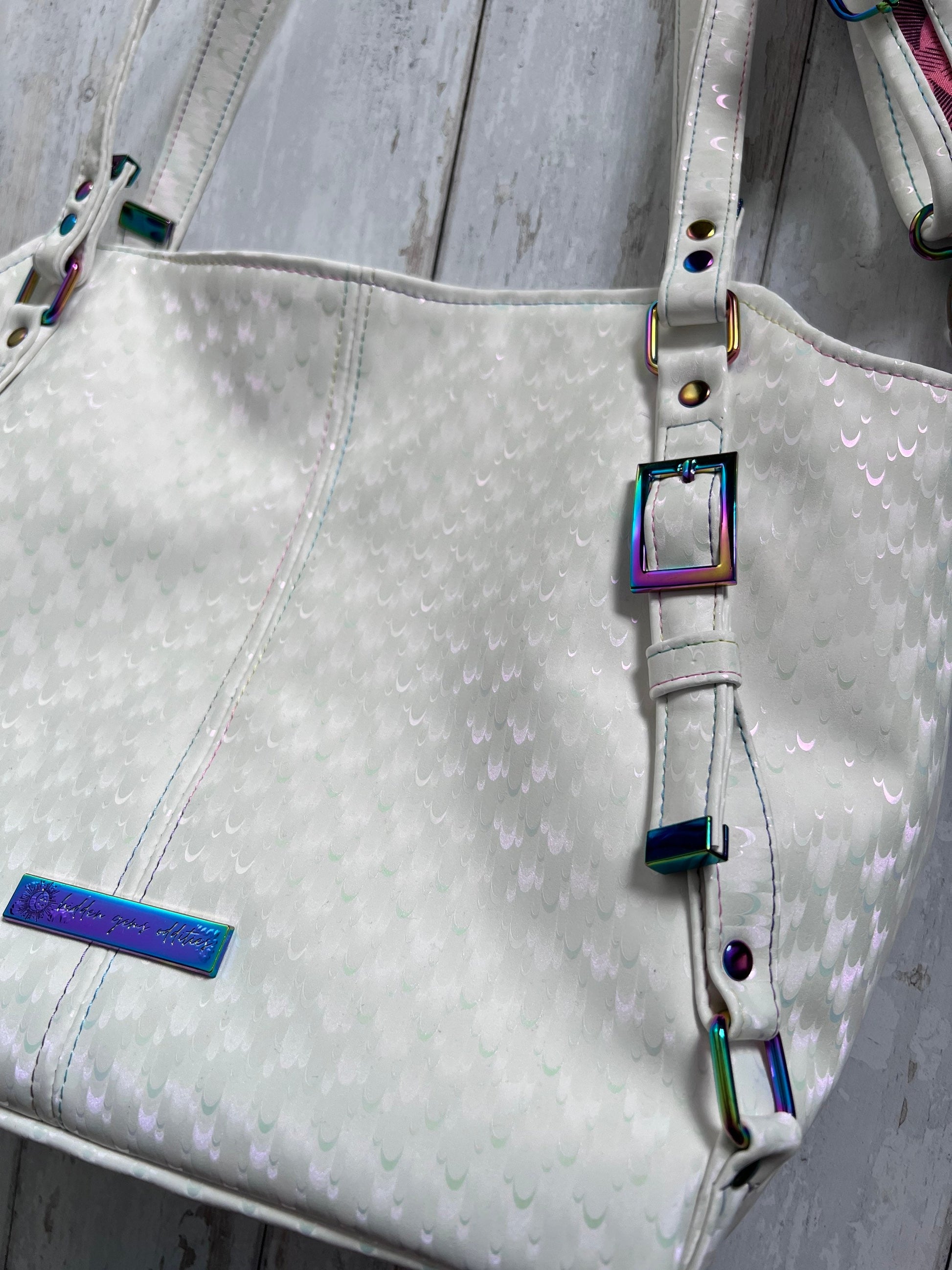 This bag is ready for a tropical summer holiday! This gorgeous white vinyl has a slight shimmer pattern that catches the light, and the rainbow hardware and contrast stitching hints at the gorgeous sunset inspired lining within. This bag is stunning inside and out and will surely turn heads at the beach, bar or out strolling in the summer sun!