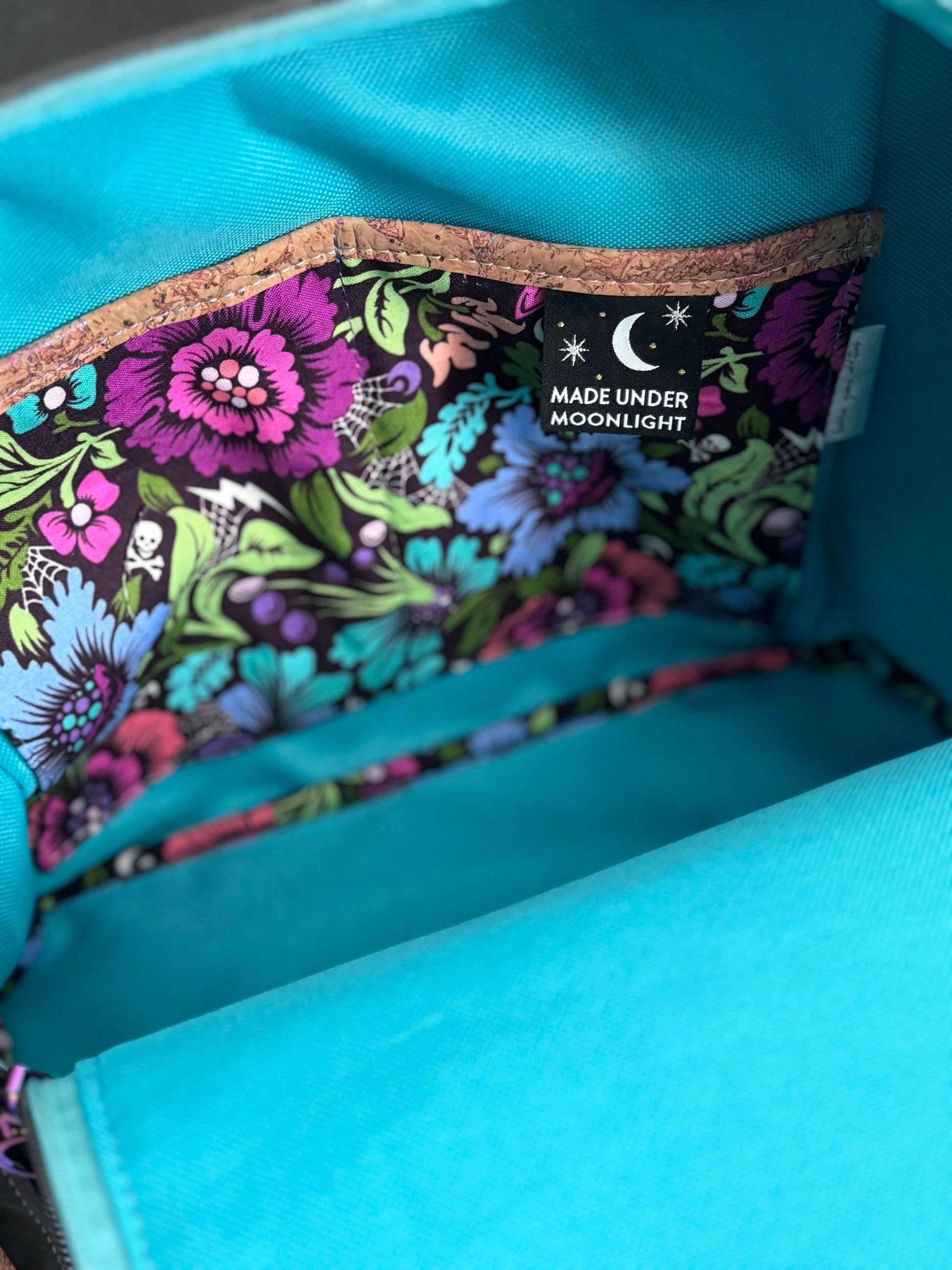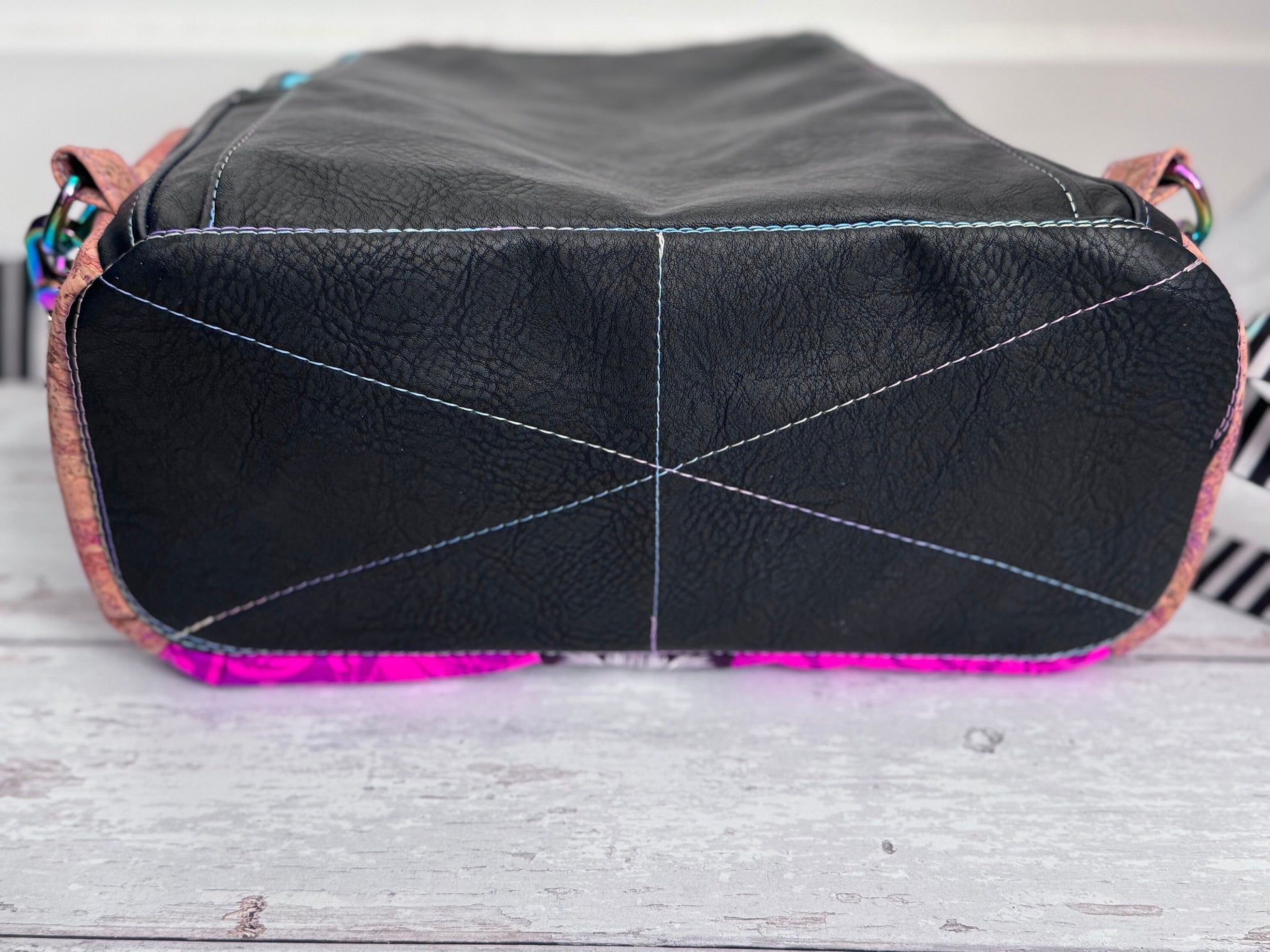 Calling all dangerous damsels, who live by their own rules rather than what society demands of them. This bag features a gorgeous Tula Pink feature print with rainbow metallic cork, super soft and hardwaring vegan faux leather and all the little touches like rainbow hardware, rainbow thread and black and white stripped webbing.
