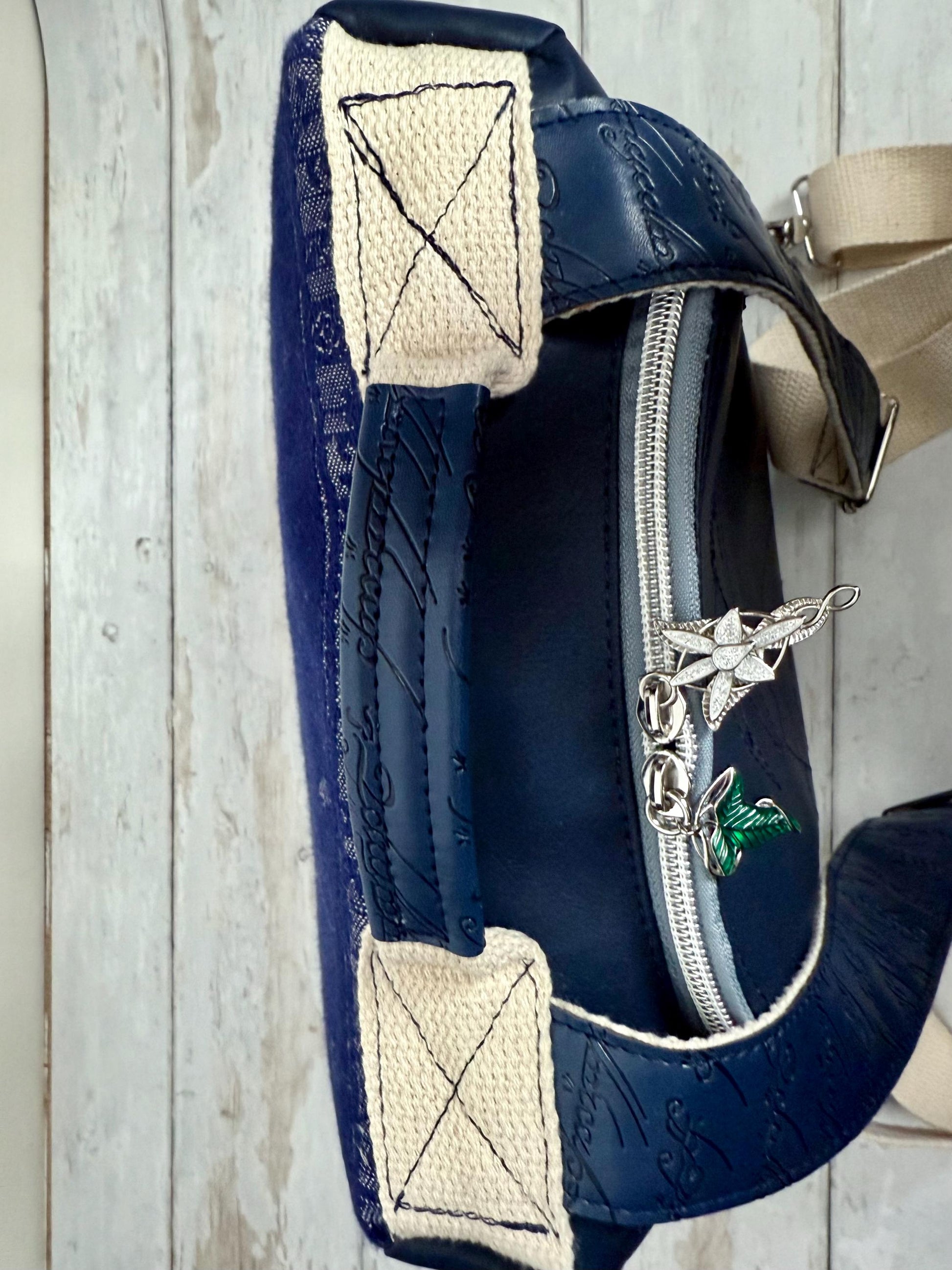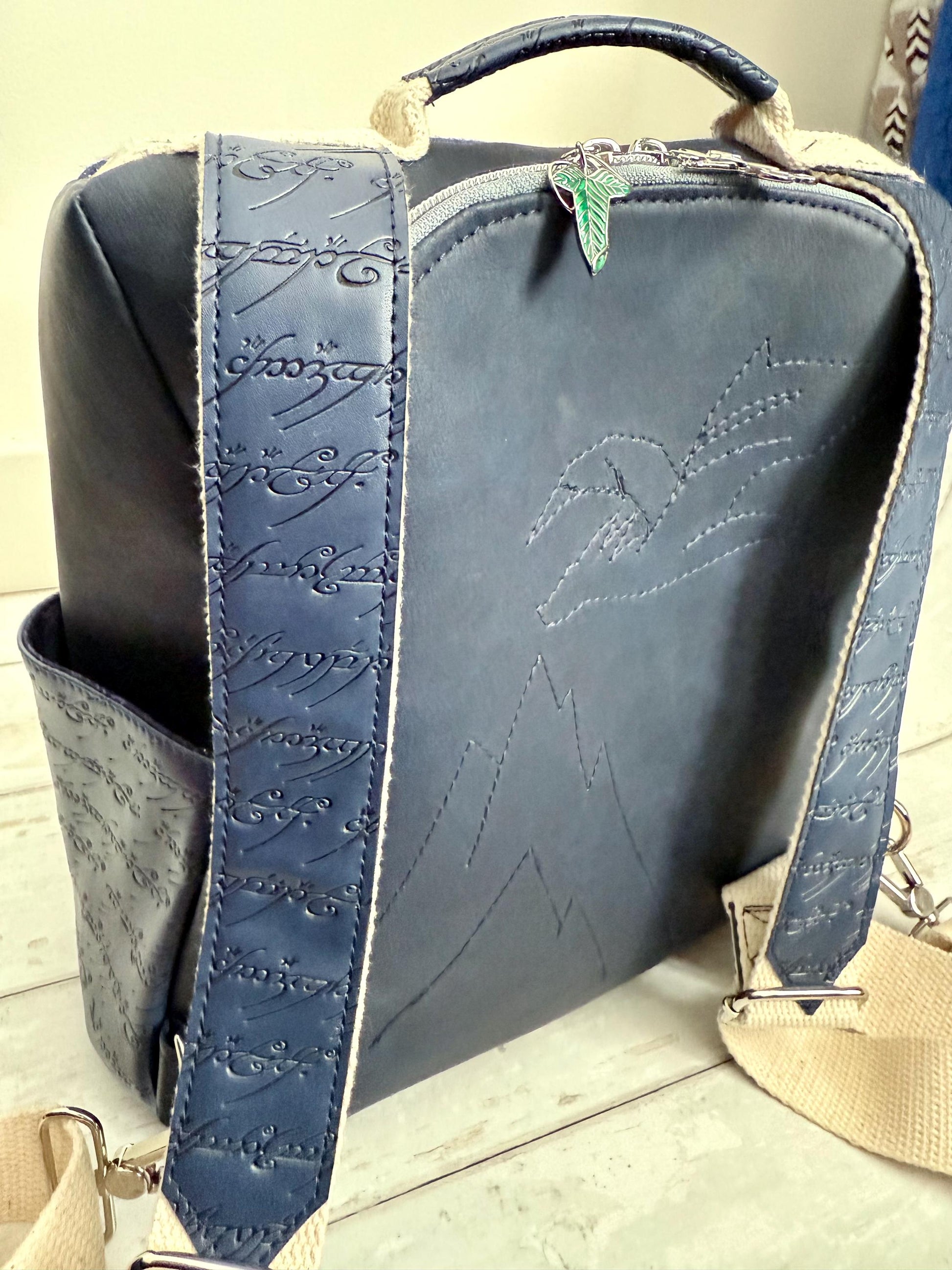 The mountains are calling - will you go? These misty mountains are picked out in gorgeous silver on a rich blue background and are the perfect match for every adventure, featuring a secure anti-theft closure with the zip against your back. Made from Oscha wrap fabric in their custom woven design, the vegan faux leather solid is made from 100% recycled plastic coordinate beautifully to make this one of kind bag that will always stand out from the crowd. Check out the strap accents and the pocket, which feature debossed script from the One Ring - this bag is one that rewards close inspection for those with a keen eye for details.